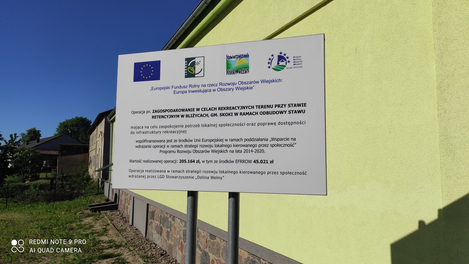 07.06.2023 r. została zawarta umowa, pomiędzy Gminą Skoki a Województwem Wielkopolskim, o przyznaniu Gminie Skoki pomocy finansowej w kwocie 45.021 zł na realizację operacji pn.: „Zagospodarowanie w celach rekreacyjnych terenu przy stawie retencyjnym w Bliżycach, gm. Skoki w ramach odbudowy stawu”