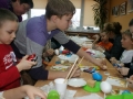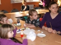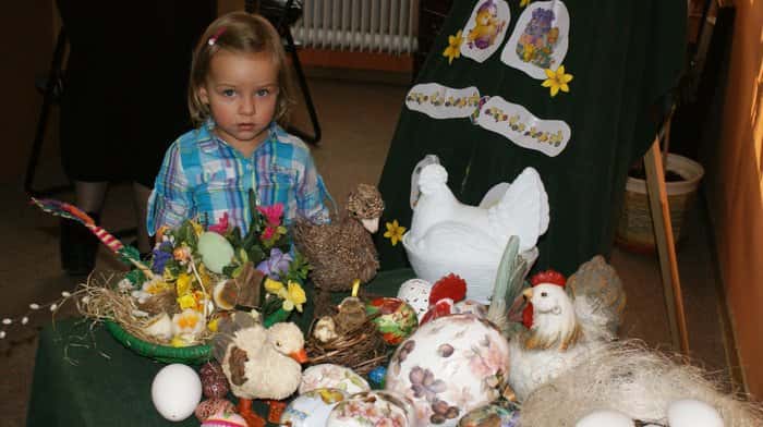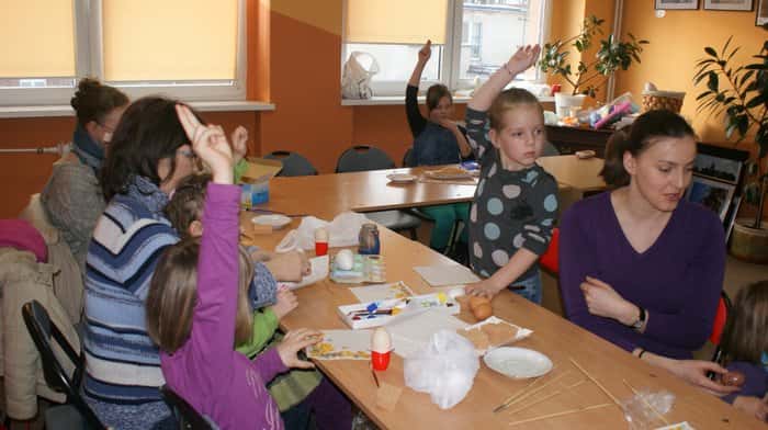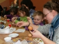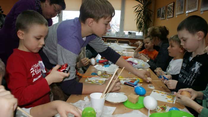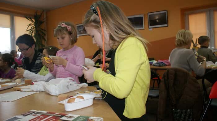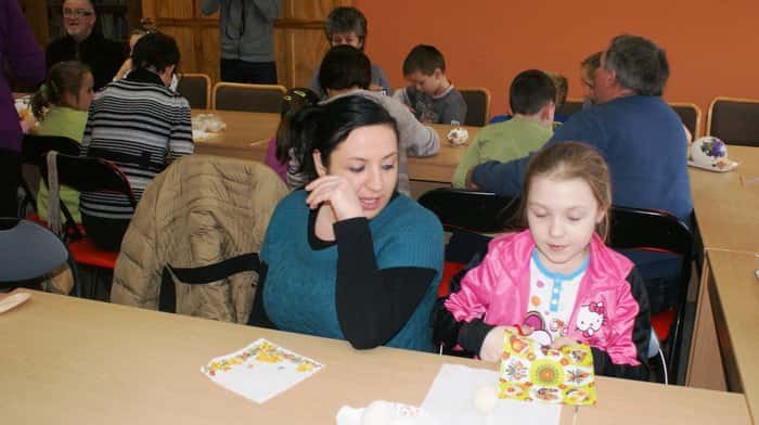 Podczas spotkania grupa trzydzieściorga dzieci wraz z rodzicami poznała nowatorską technikę zdobienia jajek zwaną decoupage. Zajęcia poprowadziła Maria Tkacz. Skoczanka zaprezentowała też mały fragment swojej niepowtarzalnej kolekcji, w skład której wchodziły pięknie przyozdobione jaja kurze, gęsie a nawet strusie.