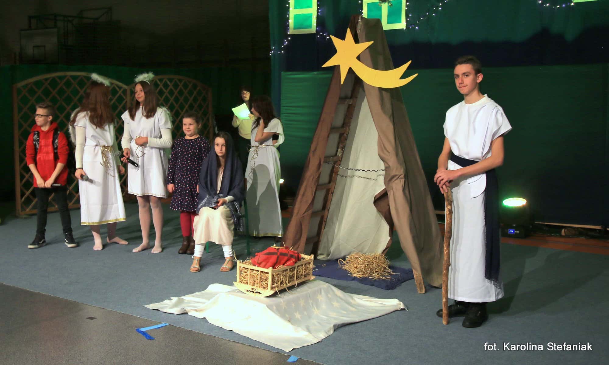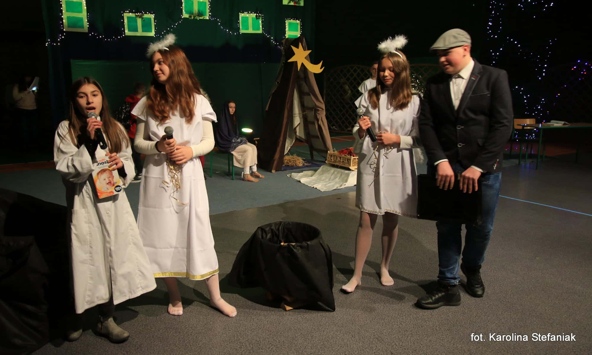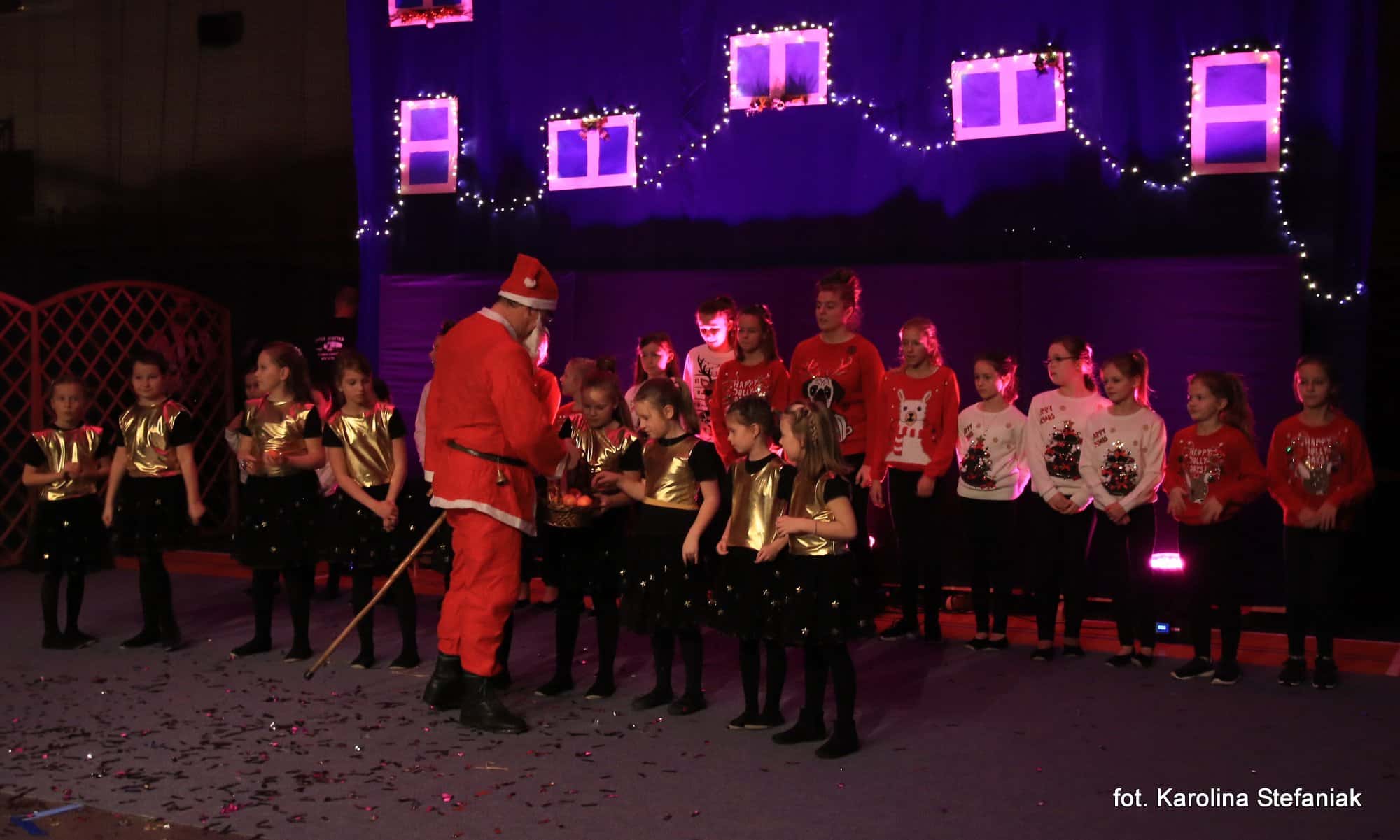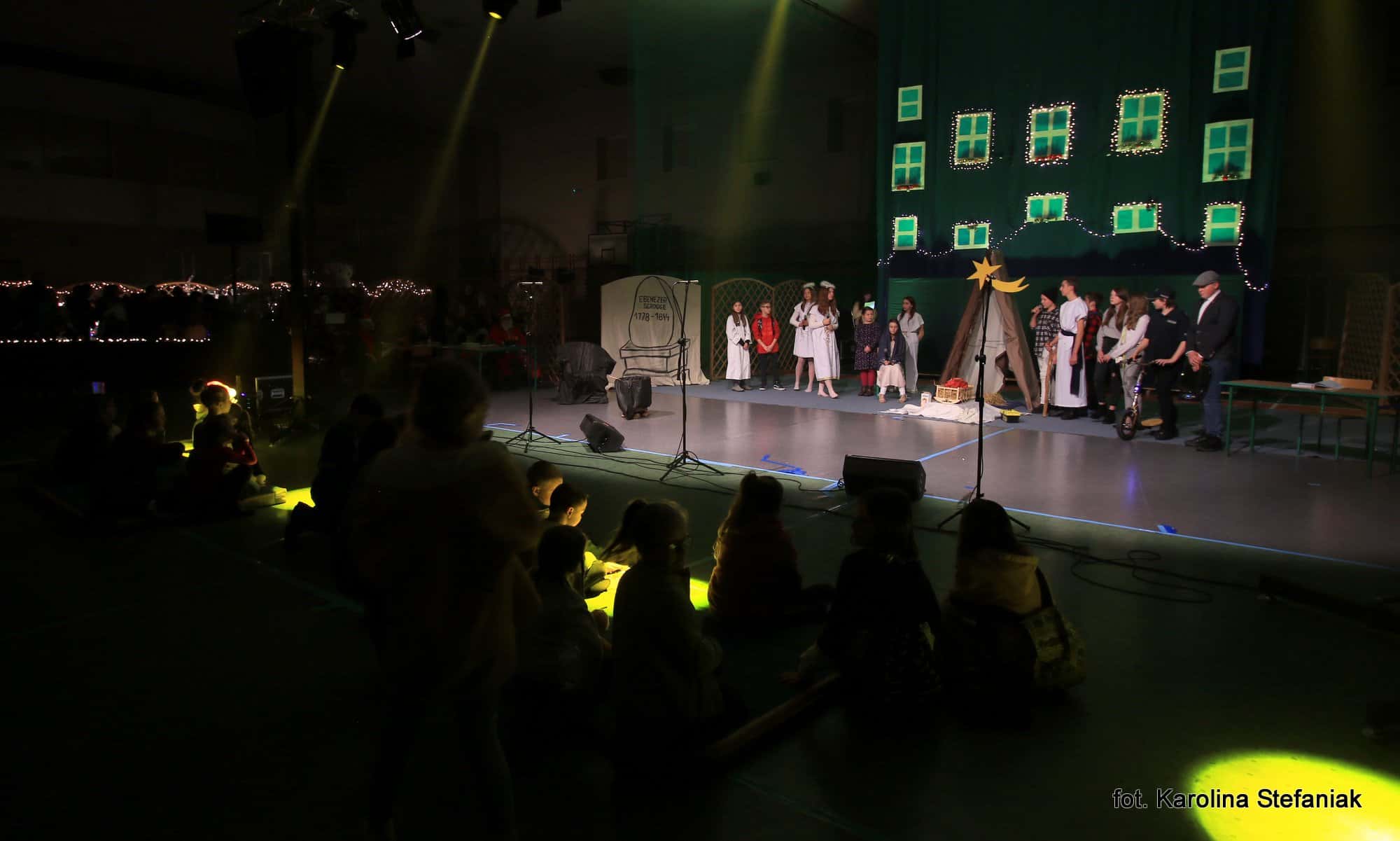 Aby umilić czas licznie przybyłym gościom uczniowie pod profesjonalnym okiem nauczycieli przygotowali dwa przedstawienia: „Opowieść wigilijna” w reżyserii Magdaleny Jeske, Agaty Orzechowskiej i Barbary Surdyk oraz „Jasełka” w reżyserii Lidii Miczyńskiej, Doroty Mrozińskiej i Wiolety Grzegorzewskiej. Na scenie oprócz naszych uczniów zaprezentowali się także lokalni artyści. Można było podziwiać m.in. młode gimnastyczki ze Studia Gimnastyki Artystycznej „Feniks”, które prowadzi Jarosława Biłorusowa-Fertsch, a także uśmiechnięte, roztańczone i rozśpiewane dziewczęta z Grupy Artystycznej „Skoczki” pod kierunkiem Małgorzaty Wiśniewskiej oraz Katarzyny i Jacka Duksztów. Mogliśmy usłyszeć przepiękny głos solisty Macieja Kujawy, profesjonalne śpiewy skocko-wągrowieckiego Chóru Kameralnego pod dyrekcją Andrzeja Kaliskiego, jak również niezawodny i emanujący pozytywną energią Emerycki Zespół Śpiewaczy „Harfa” Antoniego Wiśniewskiego oraz Orkiestrę Dętą Ochotniczej Straży Pożarnej w Skokach pod batutą kapelmistrza Artura Pokorzyńskiego.