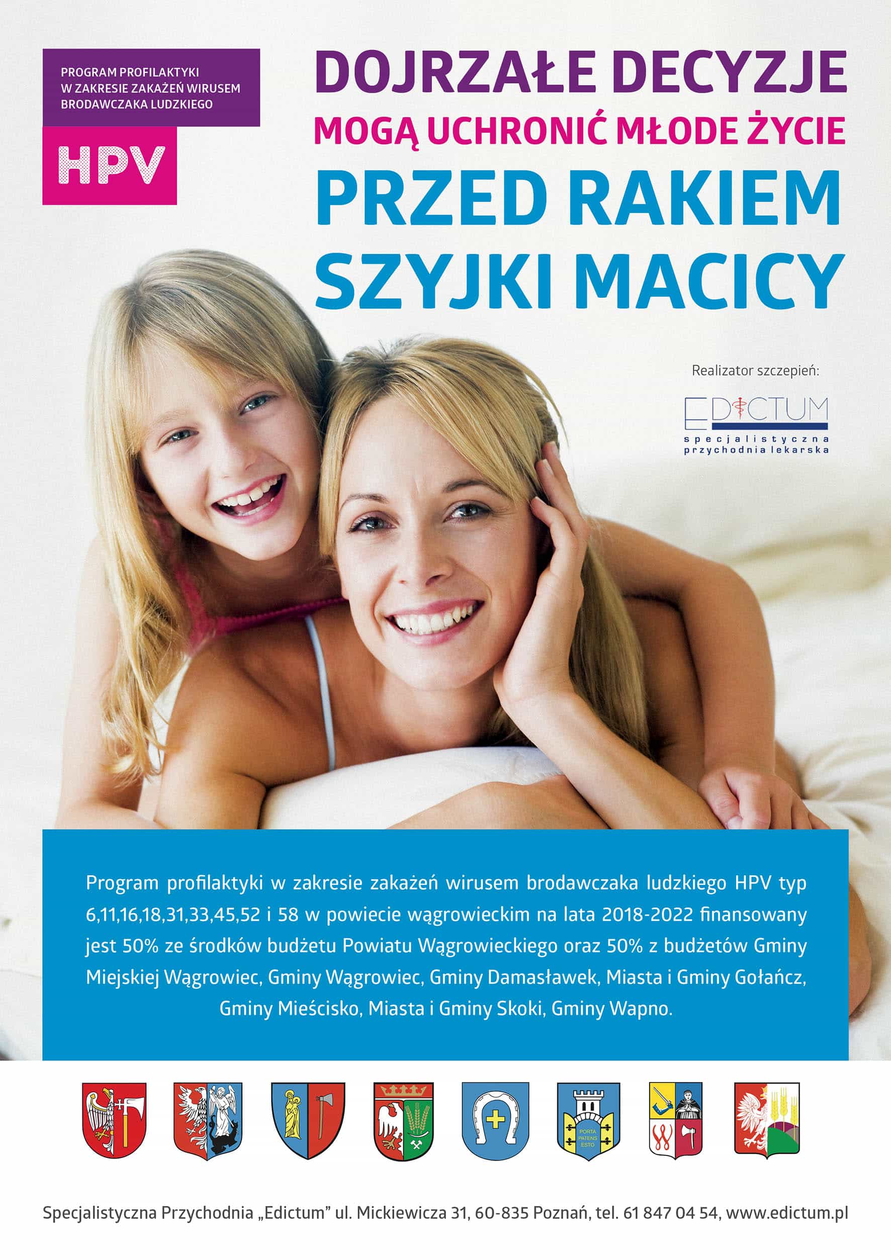 Konkurs na świadczenia zdrowotne polegające na wykonaniu szczepień przeciwko zakażeniom HPV oraz przeprowadzeniu edukacji zdrowotnej dotyczącej zapobiegania nowotworom szyjki macicy wygrała Przychodnia Lekarska „EDICTUM” Sp. z o.o. ul. Adama Mickiewicza 31 z Poznania. Szczegółowe informacje dotyczące szczepienia można uzyskać od poniedziałku do piątku pod numerem telefonu 61 847 04 54.