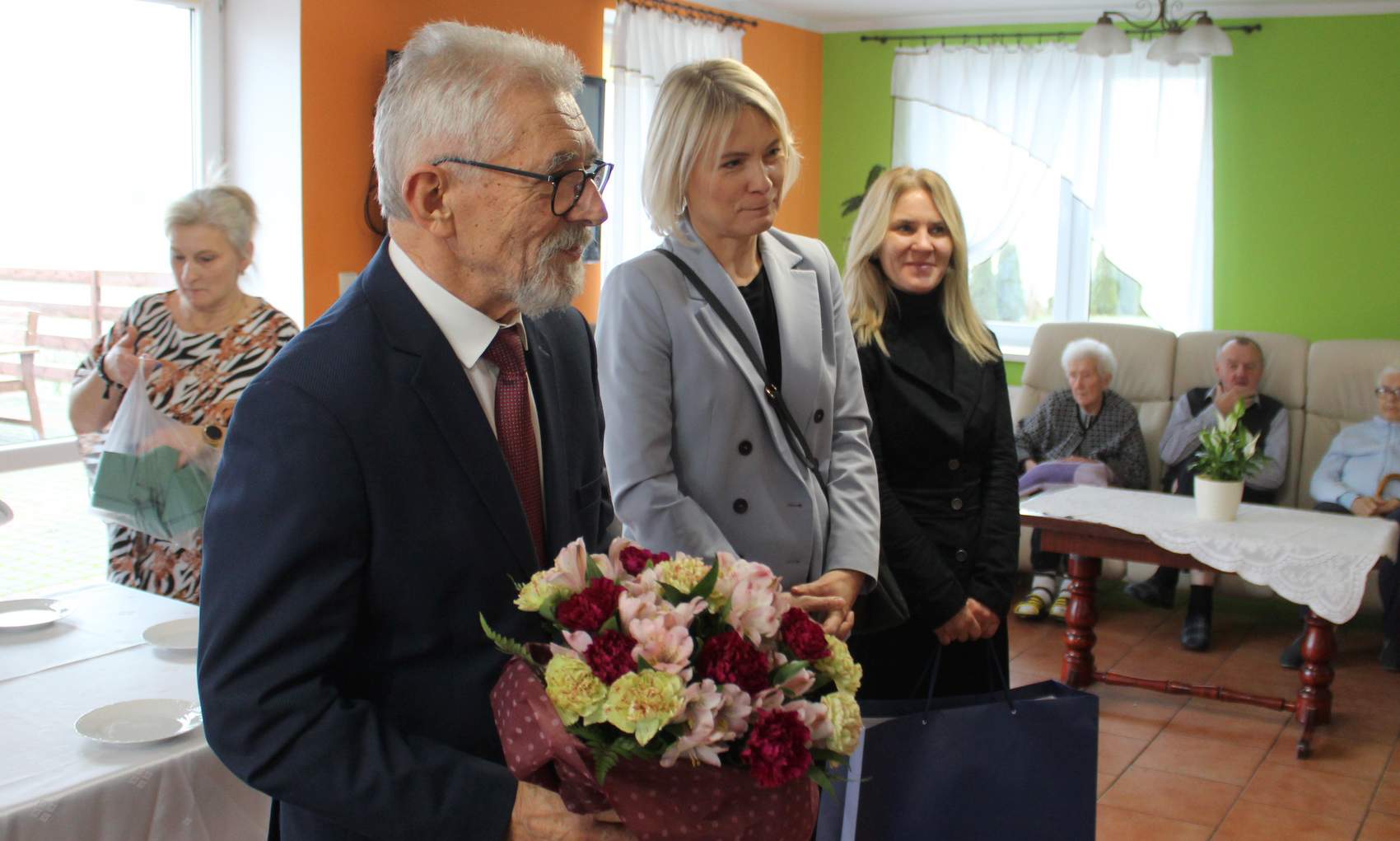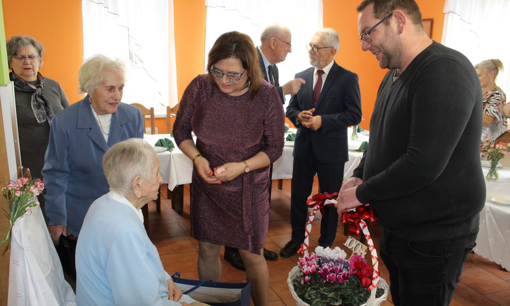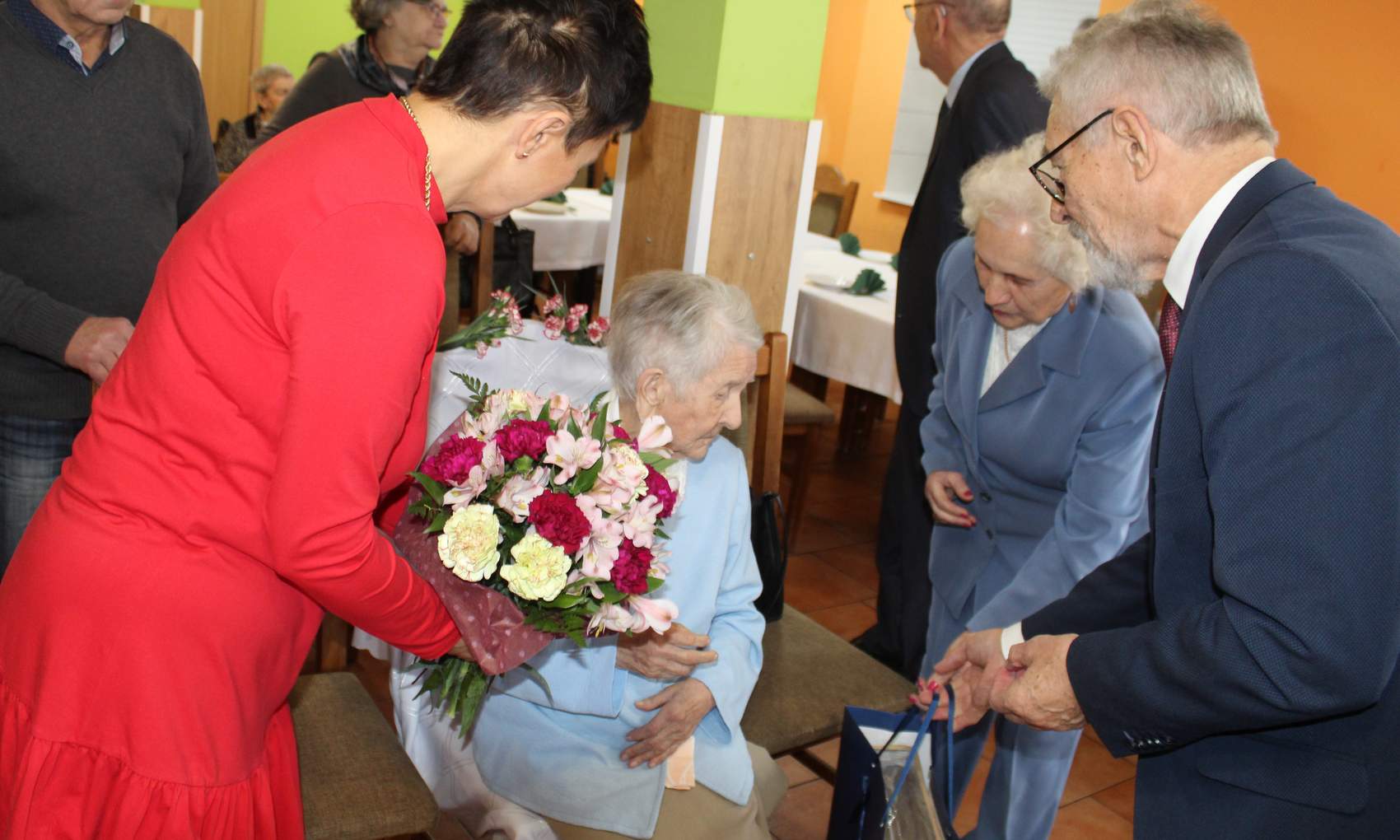 – Staramy się pamiętać o pięknych jubileuszach mieszkańców naszej Gminy i to bez względu na to, czy są tu od zawsze, czy przebywają od pewnego czasu – mówił do Marianny Klupczyńskiej burmistrz Tadeusz Kłos. – Życzymy Pani wszelkiej pomyślności i zdrowia oraz szerokiego grona przyjaciół. Jestem zaszczycony, że mogę złożyć na Pani ręce życzenia, podarować bukiet kwiatów i wręczyć nasz upominek.