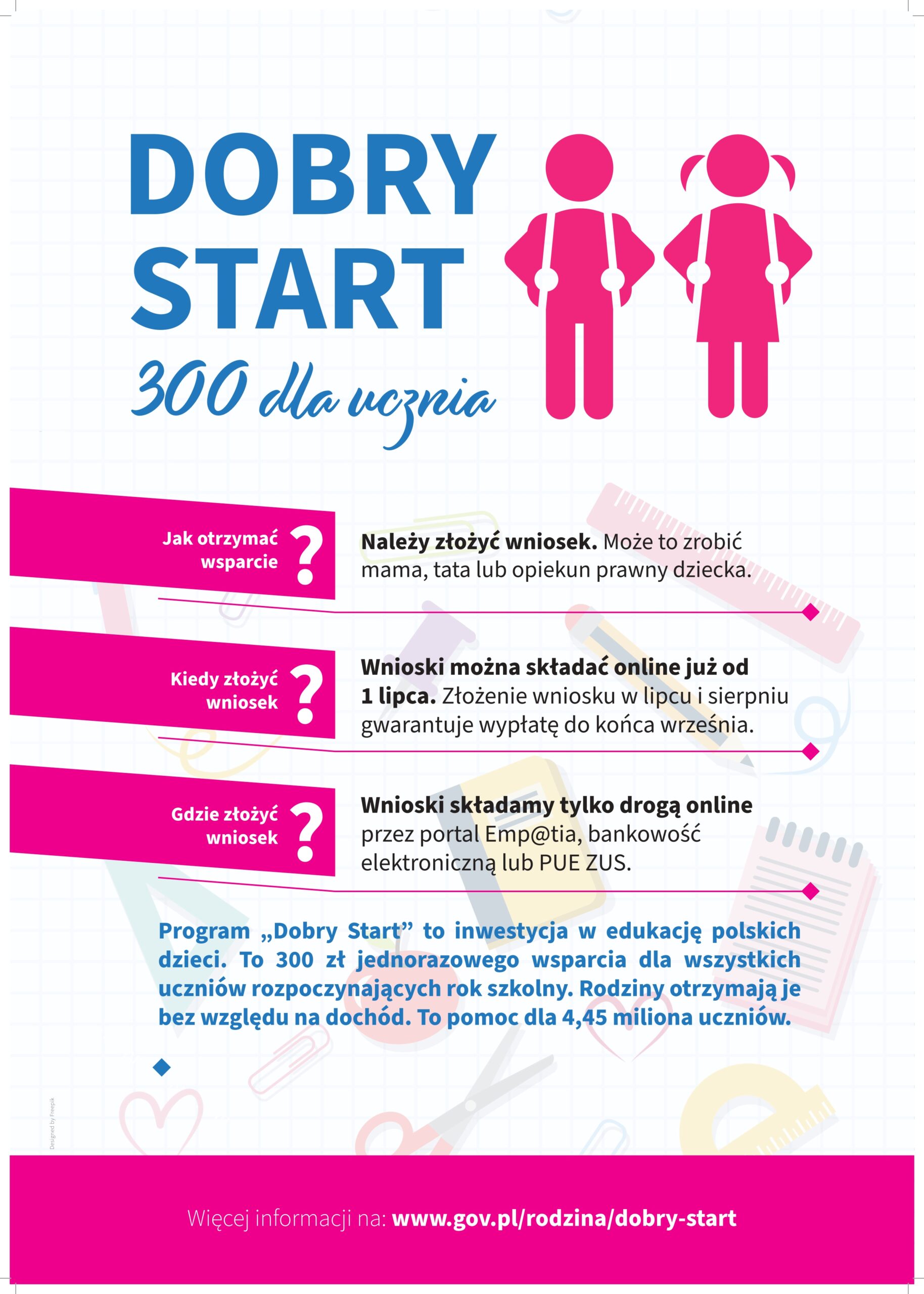 W ramach programu „Dobry Start” rodzice mogą otrzymać raz w roku 300 zł na zakup wyprawki szkolnej, czyli na przykład na zakup podręczników, zeszytów, czy przyborów szkolnych.