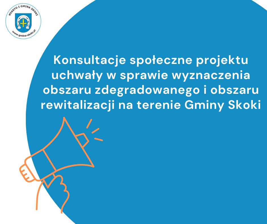 Burmistrz Miasta i Gminy Skoki zawiadamia o rozpoczęciu konsultacji społecznych projektu Uchwały Rady Miejskiej Gminy Skoki w sprawie wyznaczenia obszaru zdegradowanego i obszaru rewitalizacji na terenie Gminy Skoki.