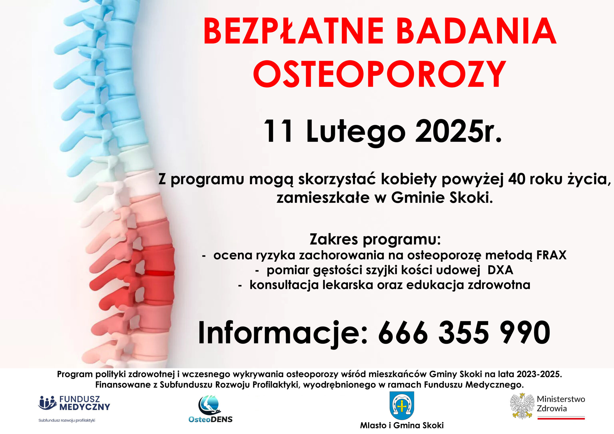 Informujemy, że bezpłatne badanie na osteoporozę oraz konsultacje lekarskie odbędą się we wtorek, 11 lutego 2025 roku, na terenie Targowiska przy ul. Kościelnej w Skokach.