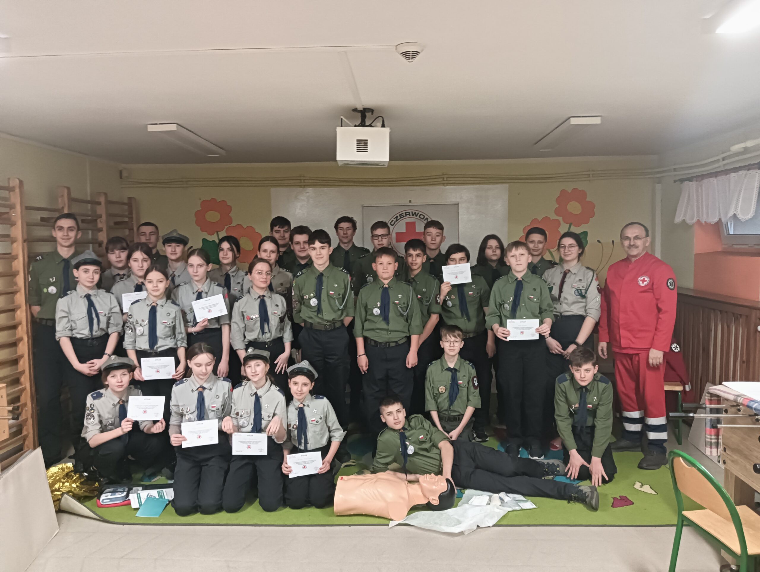 Dodatkowym elementem szkolenia był pokaz prawidłowego posługiwania się defibrylatorem AED. Druhowie ZHP wykazali zaangażowanie wartościami humanitarnymi na rzecz drugiego człowieka. Na zakończenie szkolenia prezes PCK i kierownik akcji Anna Adrych wraz z wychowawcami wręczyli dyplomy uczestnictwa w odbytym szkoleniu.