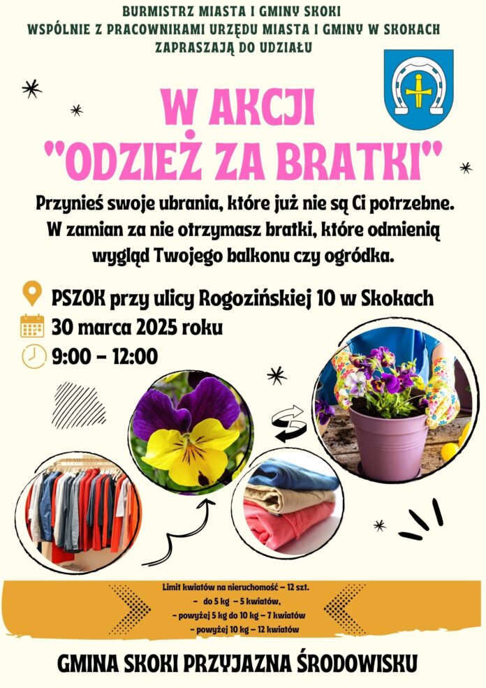 Akcja odbędzie się na placu PSZOK przy ulicy Rogozińskiej 10A w Skokach w niedzielę, 30 marca. Rozpocznie się o godzinie 9:00 i potrwa do 12:00 lub do wyczerpania puli kwiatów. Uczestnicy będą mieli możliwość wymiany oddanej odzieży na bratki, które zostaną wydane w doniczkach – załadunek i transport odbywa się we własnym zakresie.