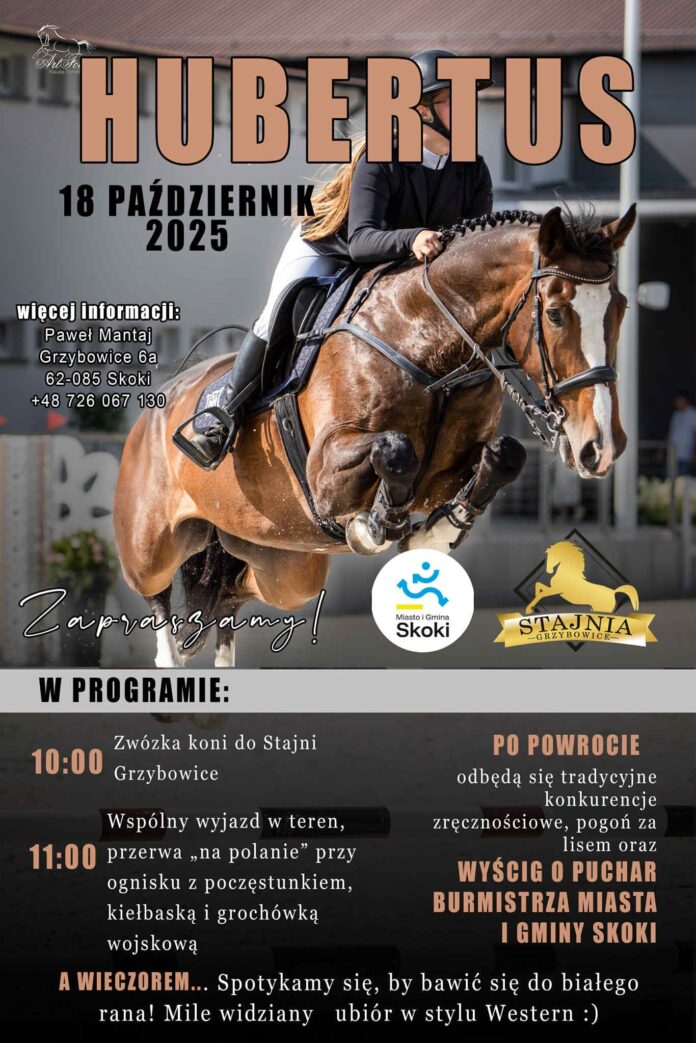 Serdecznie zapraszamy mieszkańców Miasta i Gminy Skoki na wyjątkowe wydarzenie – Hubertusa 2025, organizowane przez Stajnię Grzybowice oraz naszą gminę. To tradycyjne święto, które odbywa się w dniu patrona myśliwych – świętego Huberta, jest doskonałą okazją do radowania się z przyrody, wspólnego spędzenia czasu oraz pielęgnowania bogatych tradycji związanych z jeździectwem i myślistwem. W tym roku Hubertus odbędzie się w sobotę, 18 października, rozpoczniemy o godzinie 10:00 w Stajni Grzybowice.