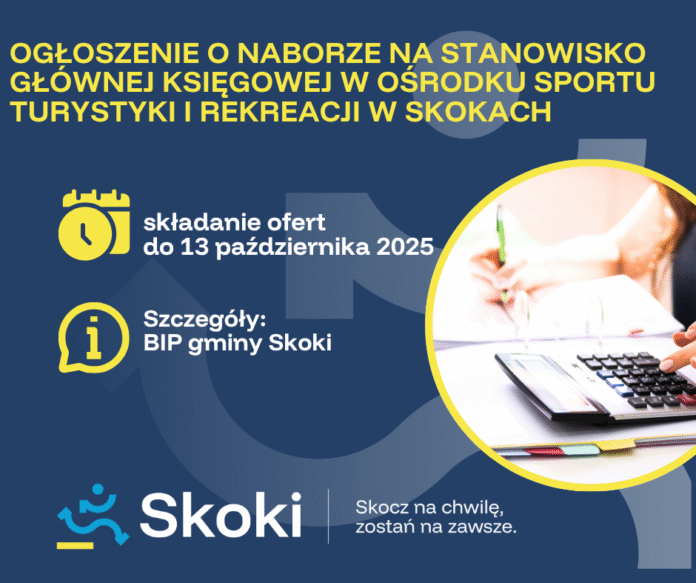 Ośrodek Sportu Turystyki i Rekreacji w Gminie Skoki ogłasza nabór na stanowisko Głównej Księgowej. Poszukujemy kandydatów, którzy spełniają szereg wymagań, w tym obywatelstwo polskie lub obywateli Unii Europejskiej, wykształcenie wyższe oraz pełną zdolność do czynności prawnych. Kandydaci muszą również cieszyć się nieposzlakowaną opinią i posiadać znajomość aktualnych przepisów dotyczących rachunkowości. Dodatkowe atuty to wykształcenie kierunkowe oraz doświadczenie w pracy na podobnym stanowisku.