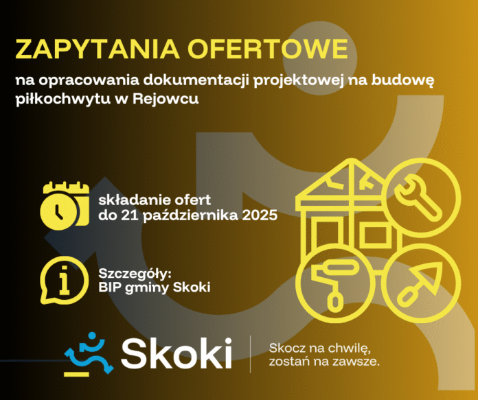 Urząd Miasta i Gminy w Skokach szuka wykonawcy do opracowania dokumentacji projektowej dla budowy piłkochwytu na boisku w Rejowcu. Dokumentacja powinna zawierać kluczowe elementy, takie jak: projekt techniczny, kosztorys inwestorski oraz projekt zagospodarowania terenu. Celem tej dokumentacji jest umożliwienie realizacji zadania pod nazwą „Budowa piłkochwytów na terenie Gminy”, co jest niezbędne do uzyskania wszelkich wymaganych pozwoleń i uzgodnień.