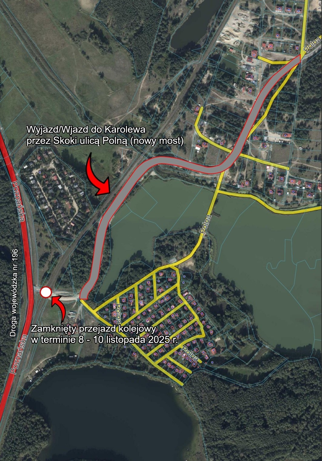 Od 8 do 10 listopada, (od soboty do poniedziałku), przejazd przez przejazd kolejowy w Karolewie będzie całkowicie zamknięty. W związku z tym mieszkańcy ulicy Polnej będą zmuszeni korzystać z alternatywnej trasy, przejeżdżając przez budowaną ulicą Polną w kierunku w Skoków. Prosimy wszystkich mieszkańców Karolewa o dostosowanie swoich planów do powyższych zmian, aby zminimalizować utrudnienia w codziennym funkcjonowaniu.