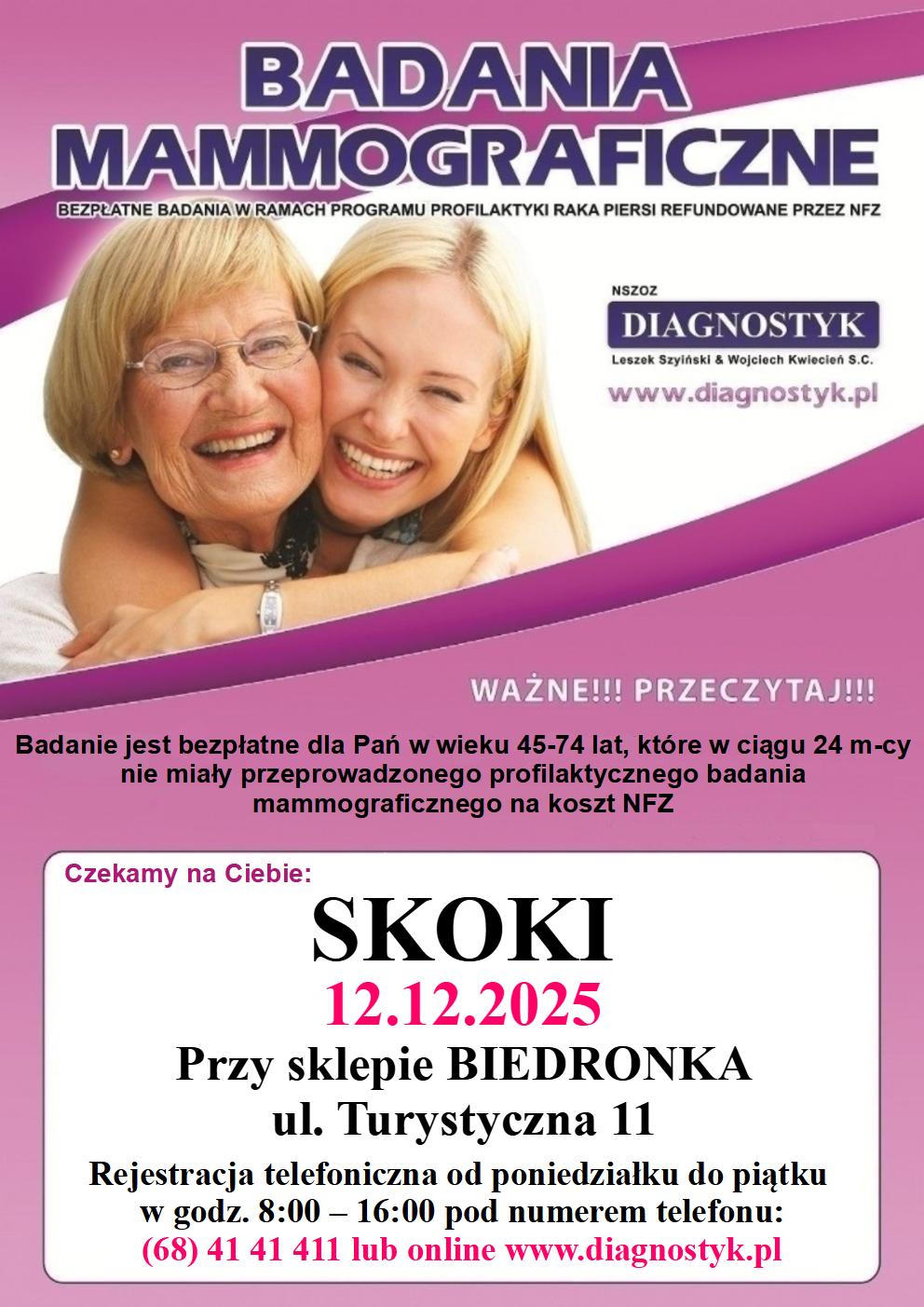 W dniu 12 grudnia (piątek) w Skokach odbędzie się bezpłatne badanie mammograficzne, które jest refundowane przez Narodowy Fundusz Zdrowia. Akcja ta jest szczególnie adresowana do kobiet w wieku 45-74 lat, które nie miały wykonywanego profilaktycznego badania mammograficznego na koszt NFZ w ciągu ostatnich 24 miesięcy. Badania odbywać się będą przy sklepie Biedronka, mieszczącym się przy ulicy Turystycznej 11, co zapewnia dogodną lokalizację dla wszystkich zainteresowanych.