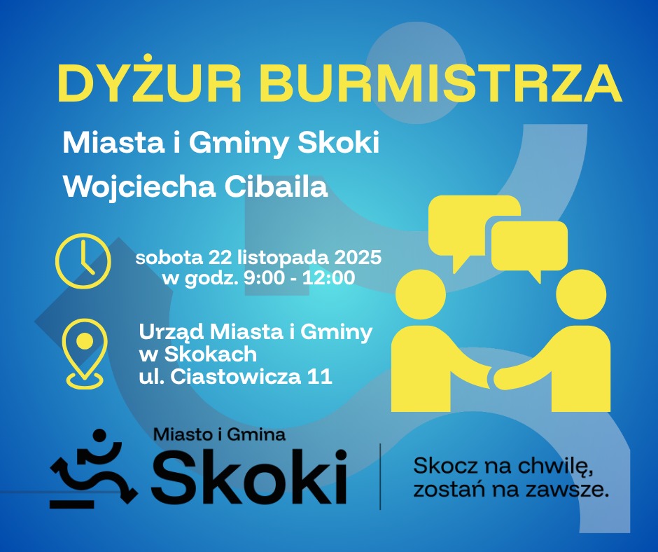 Informujemy mieszkańców gminy Skoki, że w najbliższą sobotę, 22 listopada burmistrz Wojciech Cibail będzie pełnił dyżur w godzinach od 9:00 do 12:00. To doskonała okazja, aby porozmawiać na temat spraw istotnych dla naszej społeczności oraz zgłosić wszelkie propozycje czy uwagi dotyczące funkcjonowania gminy.