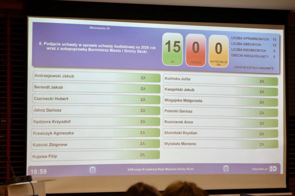 Radni Miejscy Gminy Skoki jednogłośnie przyjęli projekt budżetu na 2026 rok, co pokazuje jedność zarówno organu stanowiącego, jak i wykonawczego. Zgodnie z przedstawionym przez burmistrza Wojciecha Cibaila projektem, planowane dochody w 2026 roku wyniosą 84 741 488,62  złotych, a wydatki osiągną wartość 100 711 323,11 złotych. Planowany deficyt budżetowy na przyszły rok wyniesie 15 969 834,49 złotych, którego pokrycie zapewnią przychody z zaciągniętych pożyczek oraz kredytów. Ważnym krokiem w tym procesie było uzyskanie pozytywnej opinii projektu uchwały budżetowej przez Skład Orzekający Regionalnej Izby Obrachunkowej w Poznaniu, który nie wniósł do projektu budżetu żadnych uwag.