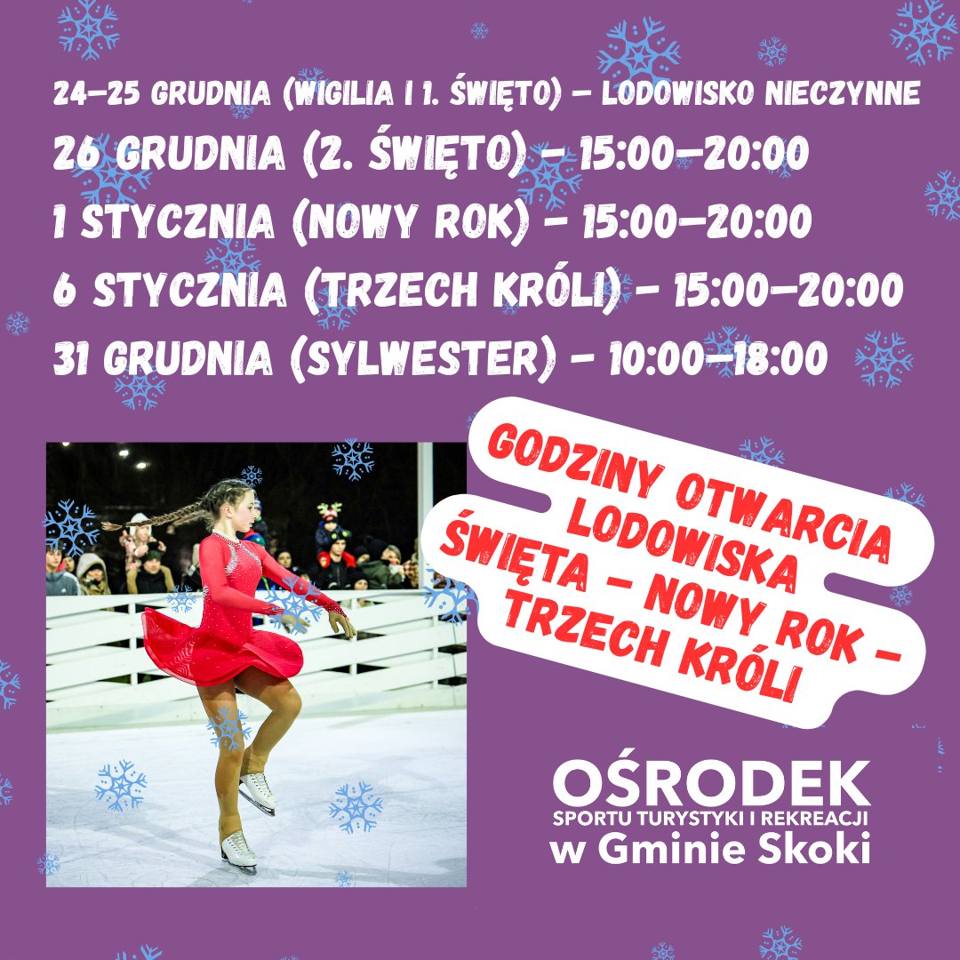 W związku z okresem świąteczno-noworocznym informujemy, że lodowisko miejskie będzie nieczynne w Wigilię oraz w pierwszy dzień Świąt Bożego Narodzenia. W trosce o komfort naszych użytkowników, zachęcamy do zaplanowania wizyty przed i po tych dniach. Warto jednak zaznaczyć, że lodowisko będzie dostępne dla miłośników jazdy na łyżwach w drugi dzień Świąt, czyli 26 grudnia.