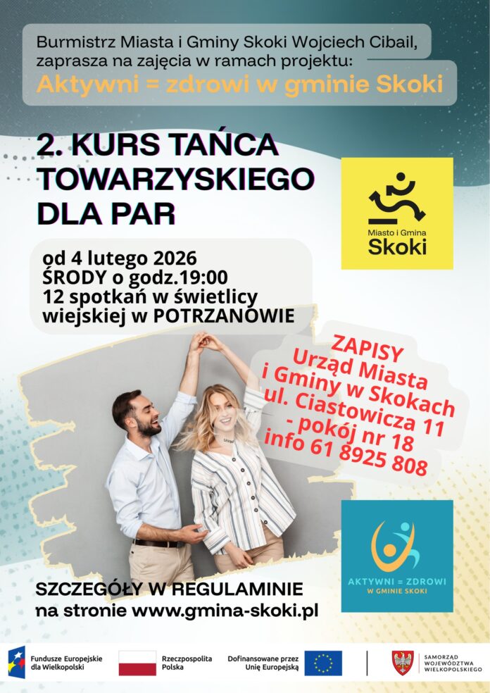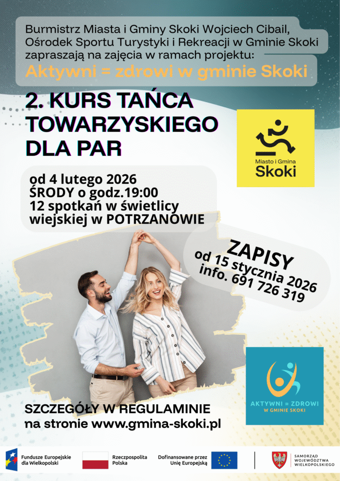 Miłośnicy tańca oraz osoby pragnące podszkolić swoje umiejętności mają ponowną okazję, aby wziąć udział w kursie tańca towarzyskiego, który ruszy w gminie Skoki od 4 lutego 2026 roku. Zajęcia odbywać się będą w każdą środę w świetlicy wiejskiej w Potrzanowie w godzinach 19:00-20:00. Kurs, realizowany w ramach projektu „Aktywni = zdrowi w gminie Skoki” i współfinansowany przez Unię Europejską (EFS+). To świetna okazja do nauki tańców latynoamerykańskich oraz standardowych, takich jak samba, salsa, walc angielski i tango.