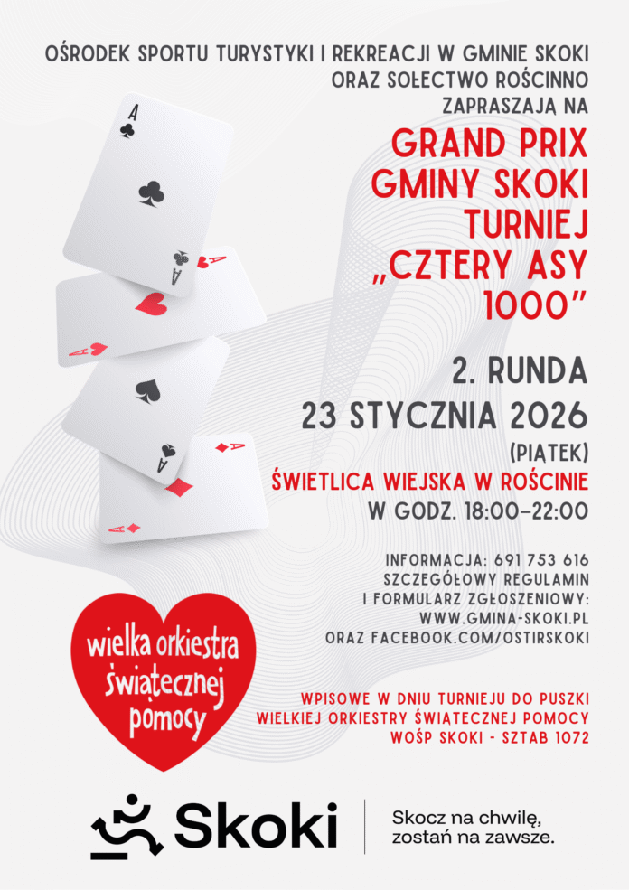 Przed nami druga odsłona Turnieju „Cztery Asy 1000”, organizowanym przez Ośrodek Sportu Turystyki i Rekreacji w Gminie Skoki, Przewodniczącego Rady Miejskiej Huberta Czarneckiego oraz Sołectwo Rościnno. Wydarzenie to świetna okazja do integracji i zabawy w miłym towarzystwie. Tym razem miejscem rywalizacji będzie świetlica wiejska w Rościnnie, która jest zaplanowana piątek, 23 stycznia, w godzinach 18:00–22:00.