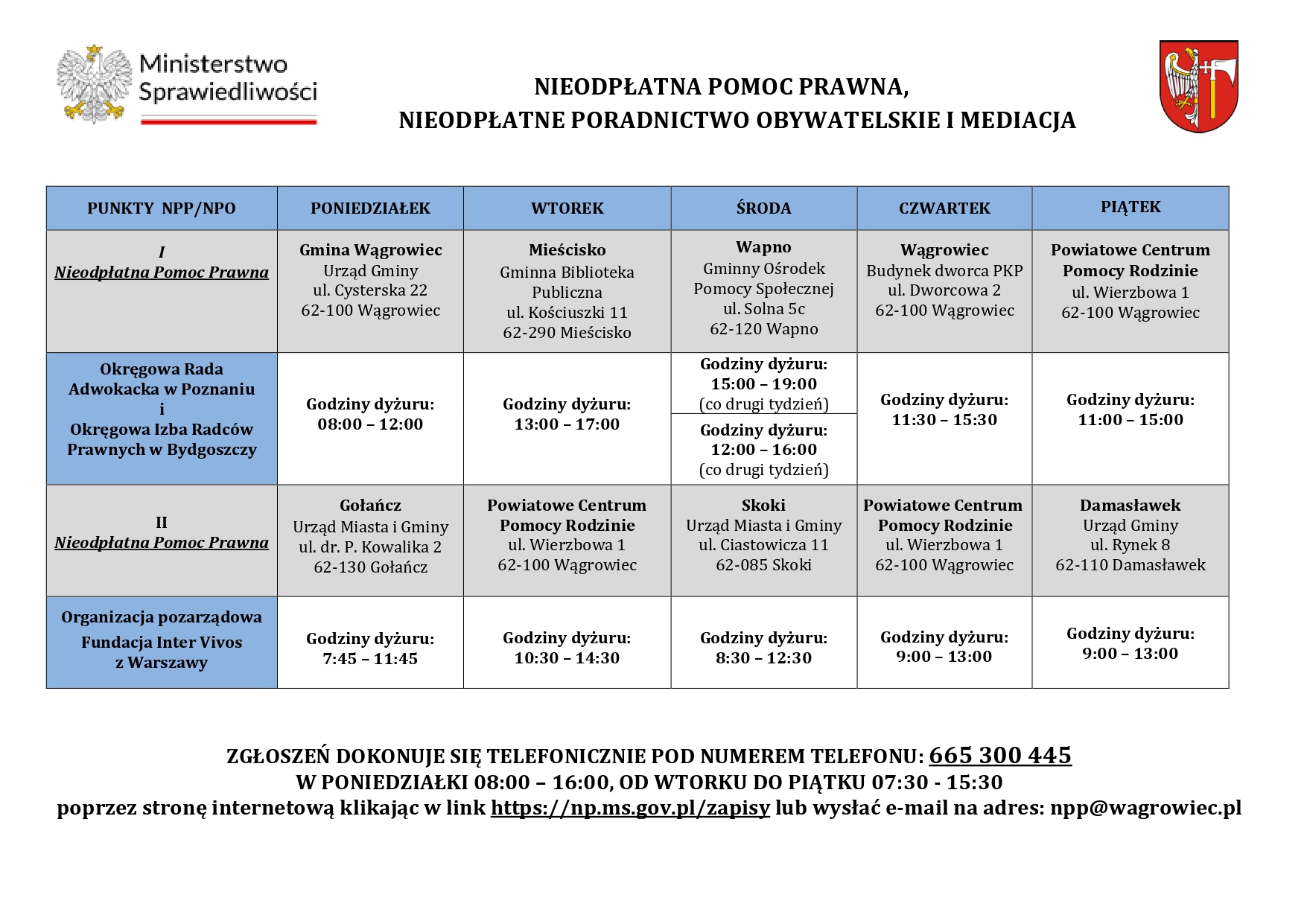 Na terenie Powiatu Wągrowieckiego w 2026 roku działają punkty nieodpłatnej pomocy prawnej oraz nieodpłatnego poradnictwa obywatelskiego. Usługi te mają na celu wsparcie mieszkańców w zakresie dostępu do pomocy prawnej i informacji obywatelskiej. System wsparcia skierowany jest do osób, które nie są w stanie pokryć kosztów usług prawnych.