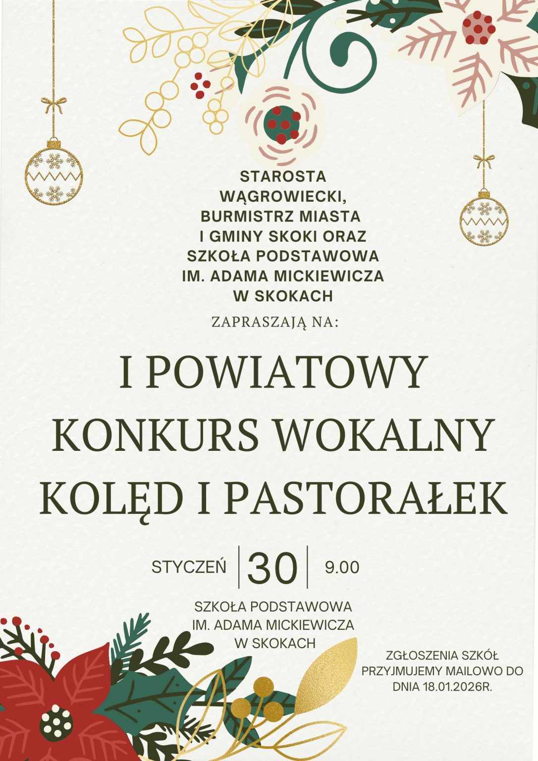 Serdecznie zapraszamy do udziału w I Powiatowym Konkursie Wokalnym Kolęd i Pastorałek, który odbędzie się 30 stycznia 2026 roku w Szkole Podstawowej w Skokach. Konkurs jest skierowany do uczniów klas I-VIII z terenu powiatu wągrowieckiego. Celem wydarzenia jest kultywowanie pięknej tradycji śpiewania kolęd oraz rozwijanie talentów dzieci i młodzieży, a także integracja środowiska szkolnego, co stanowi istotny element wspierania lokalnej społeczności.