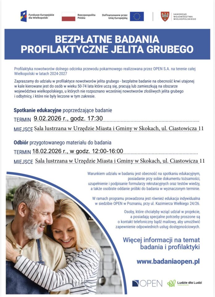 Warunkiem udziału w badaniu jest obecność na spotkaniu edukacyjnym, które odbędzie się w poniedziałek, 9 lutego o godzinie 17:30 w sali lustrzanej w Urzędzie Miasta i Gminy w Skokach. Odbiór przygotowanego materiału do badania będzie miał miejsce 18 lutego w tym samym miejscu.