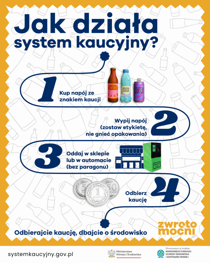Przypominamy, że od 1 października 2025 roku na terenie kraju obowiązuje system kaucyjny – mechanizm promujący recykling oraz ponowne wykorzystanie opakowań. W sklepach zaczęły pojawiać się napoje w opakowaniach oznakowanych logotypem systemu. Przy ich zakupie (przy kasie) pobierana jest opłata kaucyjna, którą odzyskać można poprzez zwrot opakowania. Można je zwrócić w dowolnym punkcie, bez konieczności okazywania paragonu za ich zakup. Puste, niezgniecione opakowania (bez zawartości) oddajemy wyłącznie z nakrętką/wieczkiem.
