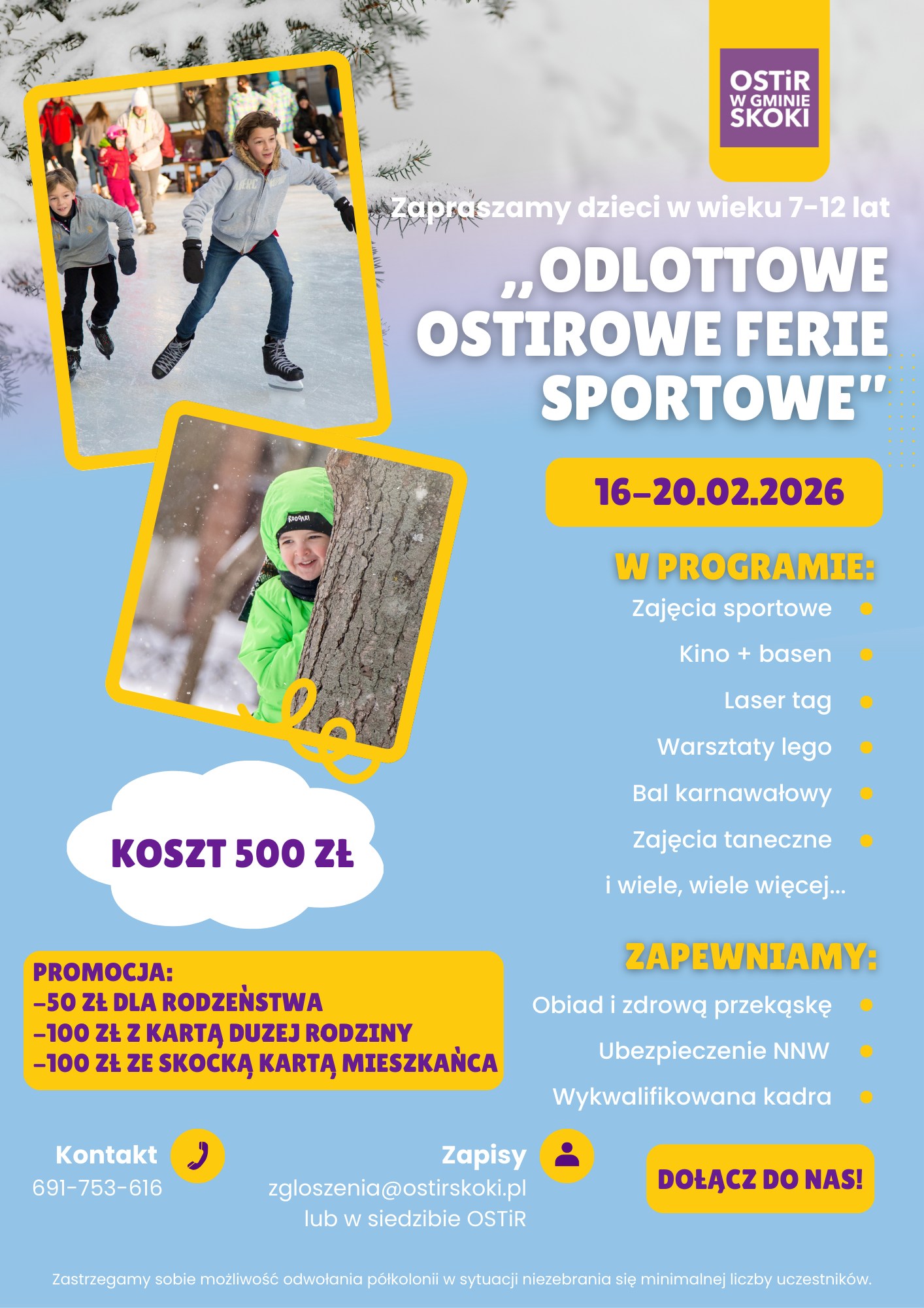 Zima wcale nie musi oznaczać nudy! Ośrodek Sportu Turystyki i Rekreacji w Gminie Skoki przygotował wyjątkową propozycję dla najmłodszych mieszkańców – Odlotowe OSTiROWE Ferie Sportowe 2026. To pięciodniowa półkolonia zimowa skierowana do dzieci w wieku 7–12 lat, łącząca aktywność fizyczną, kreatywną zabawę oraz bezpieczny wypoczynek w czasie ferii zimowych.