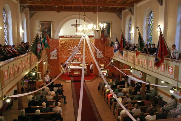 Uroczystości z okazji siedemdziesiątej rocznicy napaści ZSRR na Polskę rozpoczęły się w kościele pw. św. Piotra i Pawła Mszą św. o godzinie 18.00. Wzięli w niej udział zaproszeni goście: przedstawiciele rodzin Ofiar mordu katyńskiego, delegacja Stowarzyszenia Katyń z Poznania reprezentowana przez p. Mariana Żaka i p. Hannę Sudoł a także przedstawiciele władz samorządowych: Starosta Wągrowiecki – Michał Piechocki, radny powiatowy – Grzegorz Owczarzak, Burmistrz MiG Skoki – Tadeusz Kłos, przewodniczący Rady- Zbigniew Kujawa wraz z radnymi, sekretarz Urzędu MiG – Blanka Gaździak. W liturgii z okolicznościową homilią księdza dziekana Karola Kaczora uczestniczyli również przedstawiciele Policji oraz jak zawsze licznie przybyłe delegacje i poczty sztandarowe szkół, instytucji, związków i stowarzyszeń a także organizatorzy tej uroczystości – członkowie Skockiej Grupy Organizacyjnej „Katyń-Pamiętamy”.: Sławomiła i Franciszek Baranowscy, Krzysztof Jachna, Bożena i Michał Kołpowscy oraz Iwona i Krzysztof Migasiewiczowie.