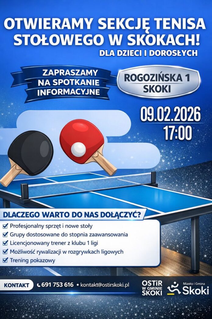 Serdecznie zapraszamy do udziału w spotkaniu informacyjnym oraz dołączenia do sekcji tenisa stołowego w Skokach.