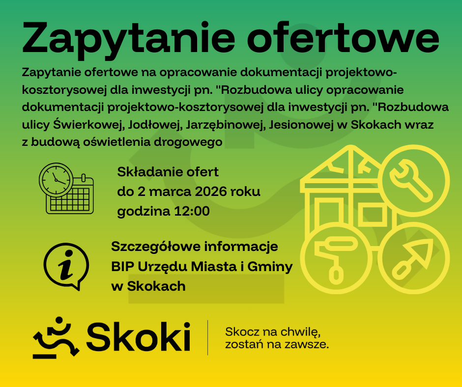 Wszystkich zainteresowanych składaniem ofert informujemy, że termin składania dokumentów upływa, 2 marca 2026 roku o godzinie 12:00. Kompletne formularze ofertowe należy dostarczyć do sekretariatu Urzędu Miasta i Gminy w Skokach.