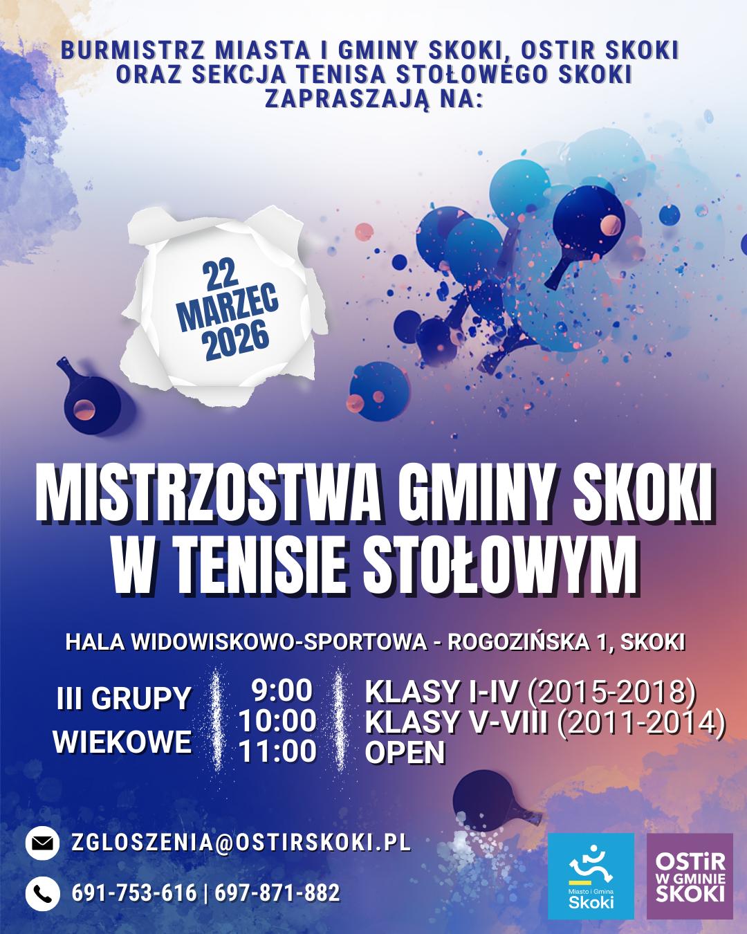 Burmistrz Miasta i Gminy Skoki, OSTiR Skoki oraz Sekcja Tenisa Stołowego Skoki zapraszają mieszkańców do udziału w Mistrzostwach Gminy Skoki w Tenisie Stołowym, które odbędą się 22 marca 2026 roku w Hali Widowiskowo-Sportowej w Skokach.