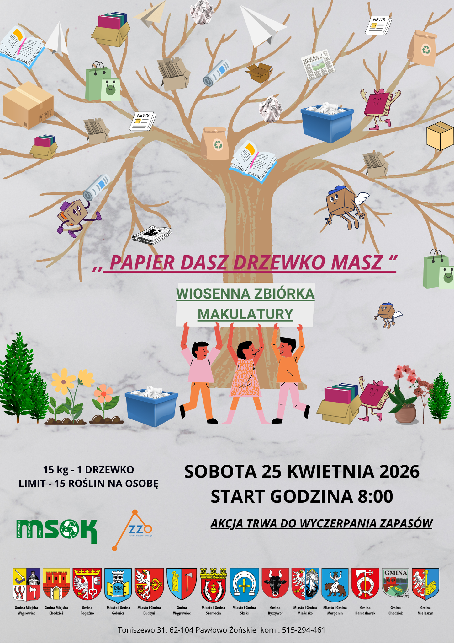 MSOK ogłasza wiosenną zbiórkę makulatury pod hasłem „Papier dasz drzewko masz”, która odbędzie się 25 kwietnia w Toniszewie, od godziny 8:00, aż do wyczerpania zapasów.