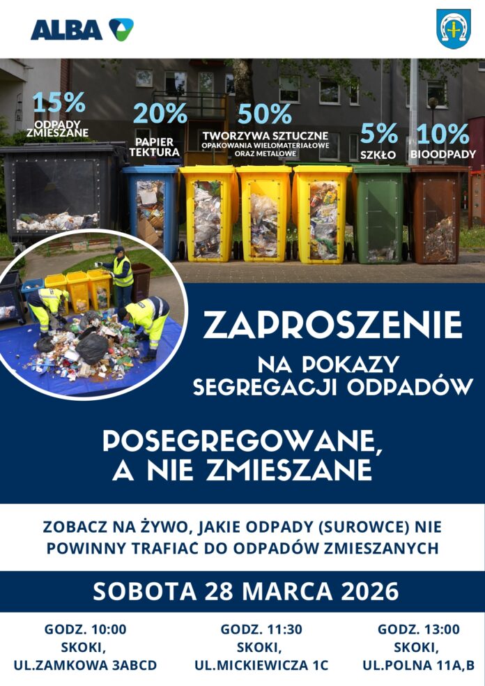 Spotkanie „Posegregowane, nie zmieszane” organizowane przez Urząd Miasta i Gminy w Skokach oraz firmę ALBA to okazja dla mieszkańców, aby utrwalić wiedzę na temat prawidłowego gospodarowania odpadami. Uczestnicy będą mieli szansę wziąć udział w praktycznych pokazach, które nie tylko zaprezentują, jak odpowiednio segregować odpady, ale również pozwolą na bezpośrednią rozmowę z osobami na co dzień zajmujących się tym zagadnieniem.
