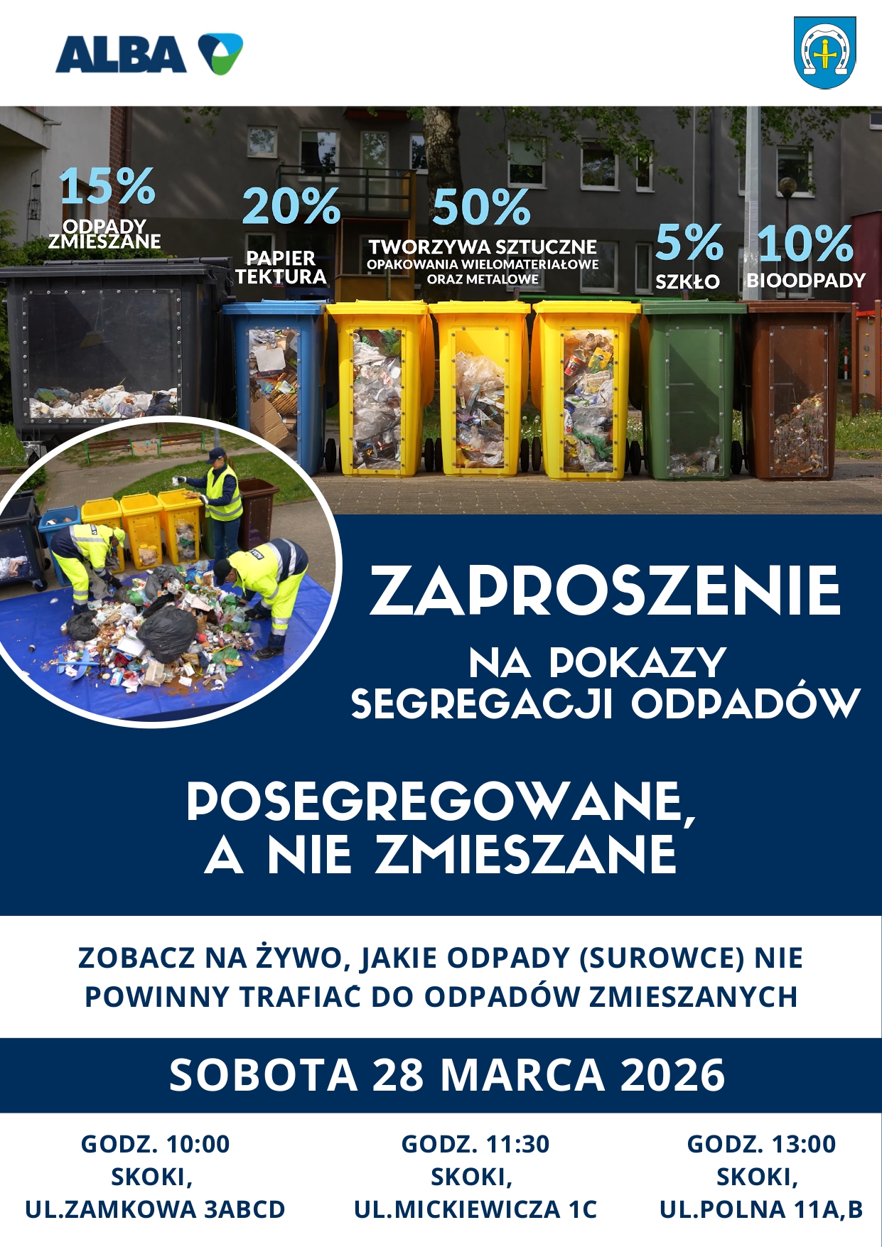 uż jutro, w sobotę, 28 marca w trzech lokalizacjach w Skokach odbędzie się pokaz pod nazwą „Posegregowane, nie zmieszane”. Zapraszamy wszystkich mieszkańców do udziału w tym wydarzeniu, które odbędzie się przy ulicy Zamkowej (10:00), Mickiewicza (11:30) oraz Polnej (13:00)