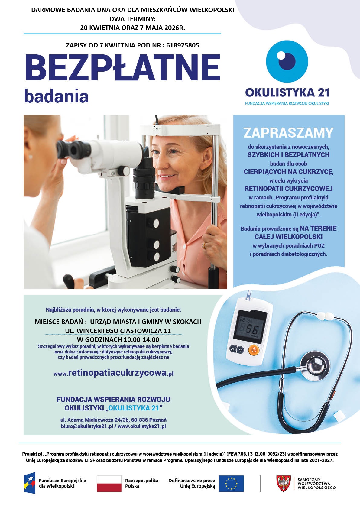 Mieszkańców Wielkopolski zapraszamy do skorzystania z bezpłatnych badań dna oka, które odbędą się w Skokach w dwóch terminach: poniedziałek 20 kwietnia oraz czwartek 7 maja. Badania, realizowane w ramach projektu „Program profilaktyki retinopatii cukrzycowej w województwie wielkopolskim (II edycja)”, prowadzone będą przez ekspertów z Fundacji Wspierania Rozwoju Okulistyki „Okulistyka 21” z Poznania. Aby wziąć udział w badaniu, niezbędne jest ukończenie 18. roku życia oraz zamieszkiwanie, nauka lub praca na terenie województwa wielkopolskiego. Osoby bezdomne muszą przebywać na obszarze Wielkopolski.