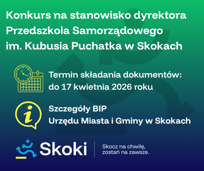 Jeszcze tylko kila dni zostało do złożenia swojej aplikacji w konkursie na dyrektora Przedszkola Samorządowego im. Kubusia Puchatka w Skokach –  ostateczny termin upływa 17 kwietnia 2026 roku.