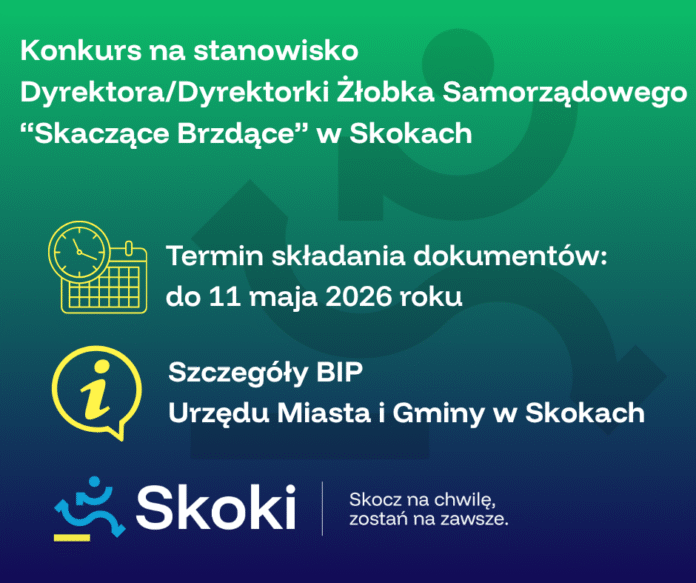 Dokumenty aplikacyjne należy składać w zamkniętej kopercie z dopiskiem „Nabór – Dyrektor/Dyrektorka Żłobka Samorządowego ‘Skaczące Brzdące’ w Skokach” osobiście w godzinach pracy urzędu lub przesłać listownie na adres Urzędu Miasta i Gminy w Skokach, ul. Wincentego Ciastowicza 11, 62-085 Skoki, do 11 maja 2026 roku. Nie dopuszcza się składania ofert w formie elektronicznej. Oferty dostarczone po terminie, niekompletne nie będą rozpatrywane.