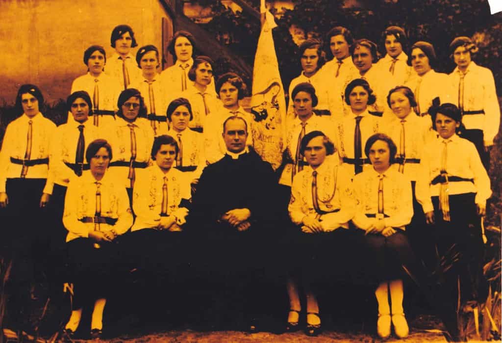 Na załączonym zdjęciu Ksiądz Józef Echaust w otoczeniu dziewcząt ze Stowarzyszenia „Młodych Polek” w Skokach.