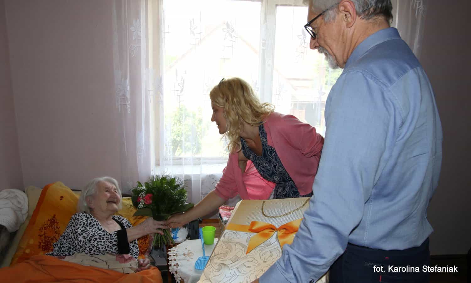 Z tej okazji Jubilatce złożono najlepsze życzenia urodzinowe oraz wręczono drobny upominek i bukiet kwiatów. Szanownej Jubilatce towarzyszyła wnuczka Monika wraz z 3-letnią prawnuczką.