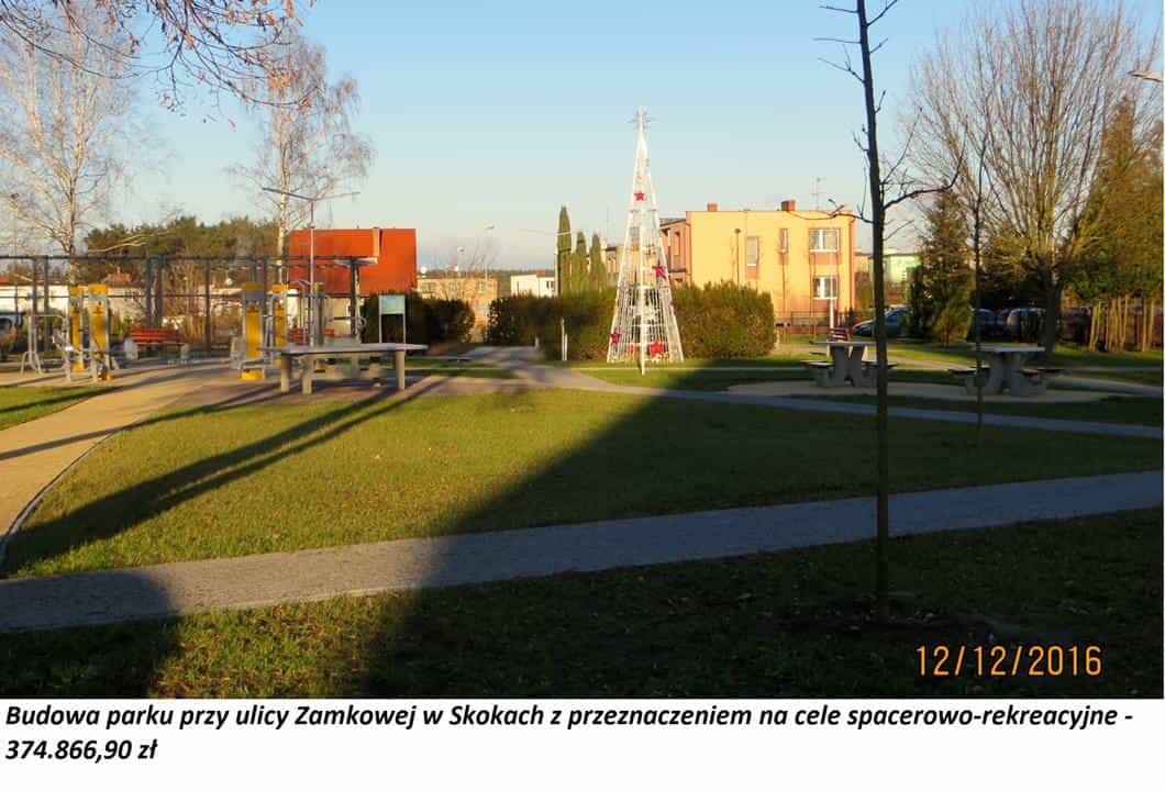 W ubiegłym roku Skoki zyskały też nowe miejsce do aktywnego wypoczynku i rekreacji, który znajduje się przy ulicy Zamkowej. Zewnętrzna siłownia, stół do gry w szachy i ping-ponga, alejki, wodotrysk i oświetlenie czynią to miejsce jednym z najczęściej odwiedzanych, również nocą. Z pewnością wydane na ten cel 375 tysięcy złotych było trafnym pomysłem.