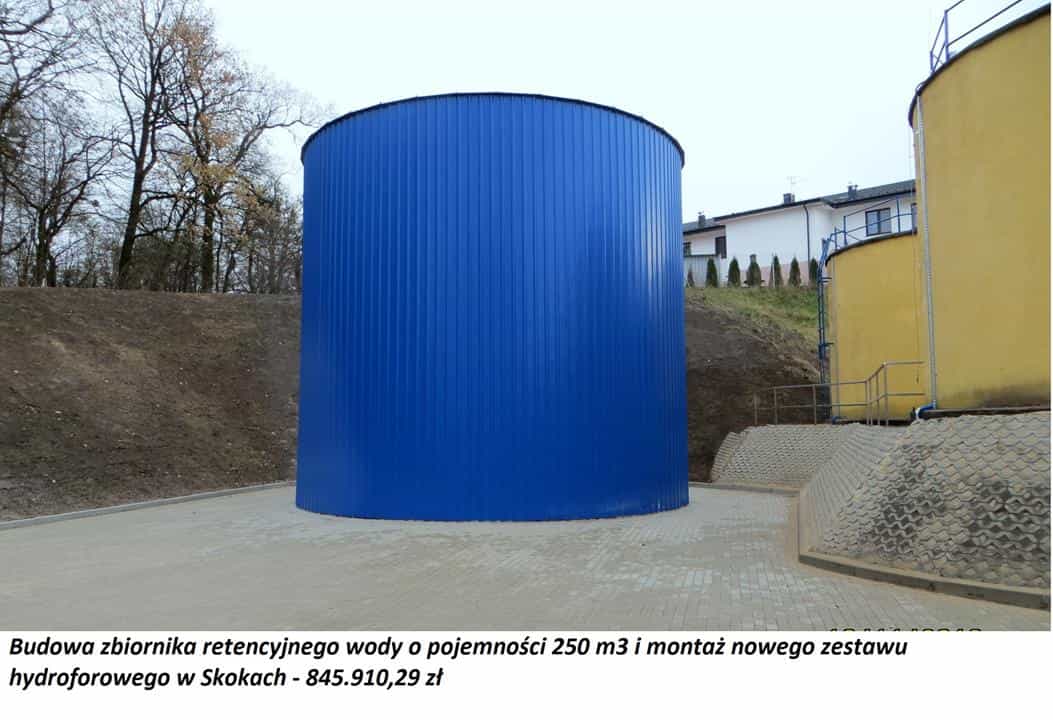 Do jednej z największej inwestycji ubiegłego roku zaliczyć można budowę zbiornika retencyjnego wody o pojemności 250 m3 i montaż nowego zestawu hydroforowego w Skokach za kwotę blisko 846 tysięcy złotych. Realizacja tej inwestycji przyczyni się do możliwości dalszego rozwoju sieci wodociągowych, w szczególności w miejscowości Sławica, gdzie już istnieje sieć kanalizacyjna. Istniejące zbiorniki niestety nie były wystarczające do dostatecznego zaopatrzenia ludności w wodę, zwłaszcza w okresie wiosenno-letnim. Znacząco powinno podnieść się też ciśnienie wody w najbardziej oddalonych domostwach.