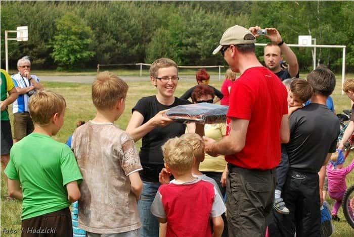 Na hasło „najliczniejsza rodzina Rajdu” zgłosiły się dwie 6-osobowe familie, którym podarowane sakwy rowerowe z pewnością się przydadzą podczas wojaży. Najmłodsi rajdowicze, 14-miesięczna Ania (w foteliku) i 9-letnia Melania (samodzielnie pokonująca trasę na rowerze) również otrzymały zachęcające na przyszłość upominki.