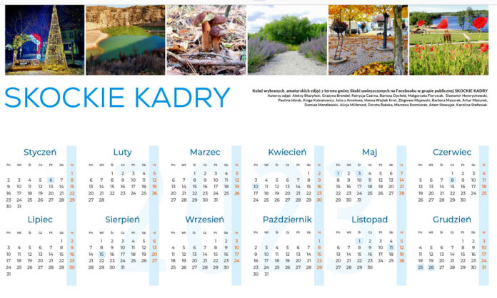 Kalendarz ścienny na 2023 wydany przez Miasto i Gmina Skoki ozdobiły amatorskie zdjęcia zrobione na terenie naszej gminy i umieszczone na stronie Facebooka SKOCKIE KADRY przez jego uczestników. Kolaż zdjęć wybrała założycielka strony, skoczanka Ala Milibrand.