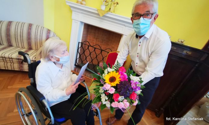 Jubilatce złożono serdeczne życzenia zdrowia, szczęścia, pomyślności oraz wręczono drobny upominek i bukiet kwiatów. Rozmowa z Jubilatką było bardzo ciekawa i przyjemna, pani Helenie z racji na wiek doskwiera co prawda trochę ciało, ale na pewno nie umysł i pamięć.