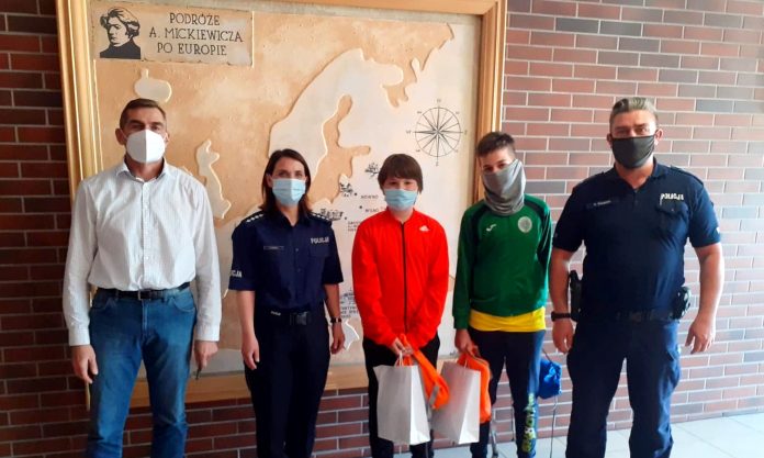 Dziś, 2 czerwca w Szkole Podstawowej w Skokach Komendant Komisariatu Policji w Skokach aspirant sztabowy Kamila Kamińska oraz młodszy aspirant Radosław Kujawa w obecności dyrektora Roberta Dorawy przekazali podziękowania i upominki Wojciechowi Baszczyńskiemu z klasy VI E oraz Jakubowi Kietrysowi z klasy VII B za obywatelską postawę.