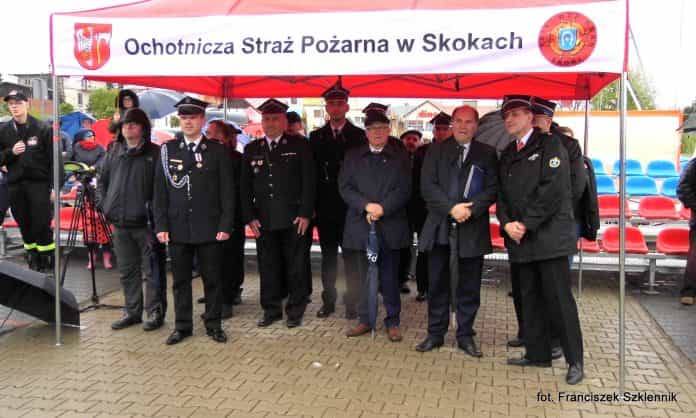 Choć sobotnie popołudnie 4 maja nie należało do iście słonecznych i ciepłych dni maja to takowe na pewno było dla wszystkich Druhen i Druhów oraz gości, którzy tego dnia zgromadzili się na płycie Skockiego Targowiska by wspólnie świętować Dzień Strażaka. Wspólną uroczystość rozpoczął hymn strażacki- Rycerze Floriana, który odśpiewany został przy dźwiękach instrumentów Orkiestry Dętej Ochotniczej Straży Pożarnej w Skokach. Następnie głos zabrał druh prezes Piotr Kaczmarek, który przywitał gości w szczególności Panów Tadeusza Kłosa – Burmistrza Miasta i Gminy Skoki (gospodarza terenu) oraz Pana Bogdana Fleminga – Dyrektora Oddziału Terenowego Krajowego Ośrodka Wsparcia Rolnictwa w Poznaniu, którzy zechcieli być współorganizatorami święta, a także Panów Parlamentarzystów: