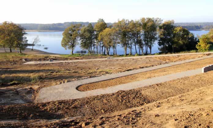 Wykonanie zejścia do jeziora w formie chodnika, którego trasa w celu zachowania normatywnego 6% pochylenia została zaprojektowana wzdłuż warstwic wysokościowych. Chodnik utwardzony kostką betonową Domino Eko o gr.6cm na podbudowie z tłucznia o łącznej powierzchni 1273.00m2;