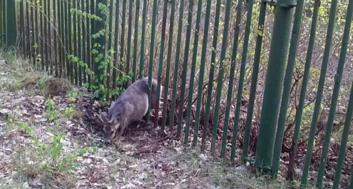 Pierwszego maja z żoną i naszą znajomą wybraliśmy się na wycieczkę w stronę łowiska za „Pompką”. Przejeżdżając koło dawnego Ośrodka Wypoczynkowego Z.N.T.K. /obecnie prawie ruina/ w płocie okalającym ten obiekt zauważyliśmy zaklinowaną sarnę. Zwierzę przecisnęło między grubymi prętami klatkę piersiową i brzuch, ale utknęły biodra. Mimo usilnych starań, nie byliśmy wstanie rozgiąć tych prętów. Przejeżdżający chłopcy zadzwonili po pomoc do naszej Ochotniczej Straży Pożarnej. Strażacy szybko przyjechali i za pomocą specjalnego urządzenia rozsunęli pręty. Sarna była wolna i na chwiejnych nogach powoli poszła w las. Dodać wypada, że była „kotna”, czyli w ciąży i chyba na tzw. „ostatnich nogach”.