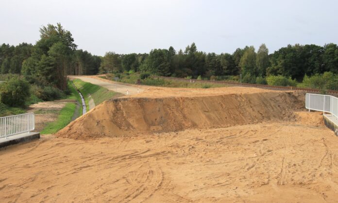 Obecnie pod kontrolą zatrudnionego przez Gminę Kierownika budowy przeprowadzana jest konsolidacja gruntu. Polega ona na obciążeniu podłoża nasypu nadkładem, w wyniku czego dochodzi do zmniejszenia objętości porów gruntu i osiadania nasypu. Jest to sprawdzona i najtańsza metoda. Wiele istniejących nasypów komunikacyjnych (w tym nasypy kolejowe) budowanych było w ten oto sposób.